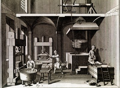Eine Papiermühle - Schreibwaren: Collage - „Die Große Enzyklopädie, oder Wörterbuch der Wissenschaften, Künste und Berufe“ von Denis Diderot (1713-1784) und Jean d'Alembert (1717-1783)(A paper mill - Stationery: Collage - “” The Great Encyclopedie, ou Dictionnaire Raisonne des Sciences, des Arts et des Metiers” (Encyclopedia or Dictionary of the Sciences, Arts and Professions) by Denis Diderot (1713-1784) and Jean d'Alembert (1717-1783).)French School |
