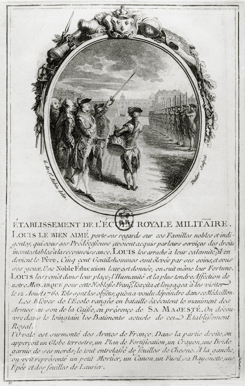 Ludwig XV. (1710-74) besucht die Ecole Militaire in Paris, 12. August 1760, graviert von Antoine Duclos (1742-97)(Louis XV (1710-74) Visiting the Ecole Militaire in Paris, 12nd August 1760, engraved by Antoine Duclos (1742-97) )Gabriel de Saint-Aubin |