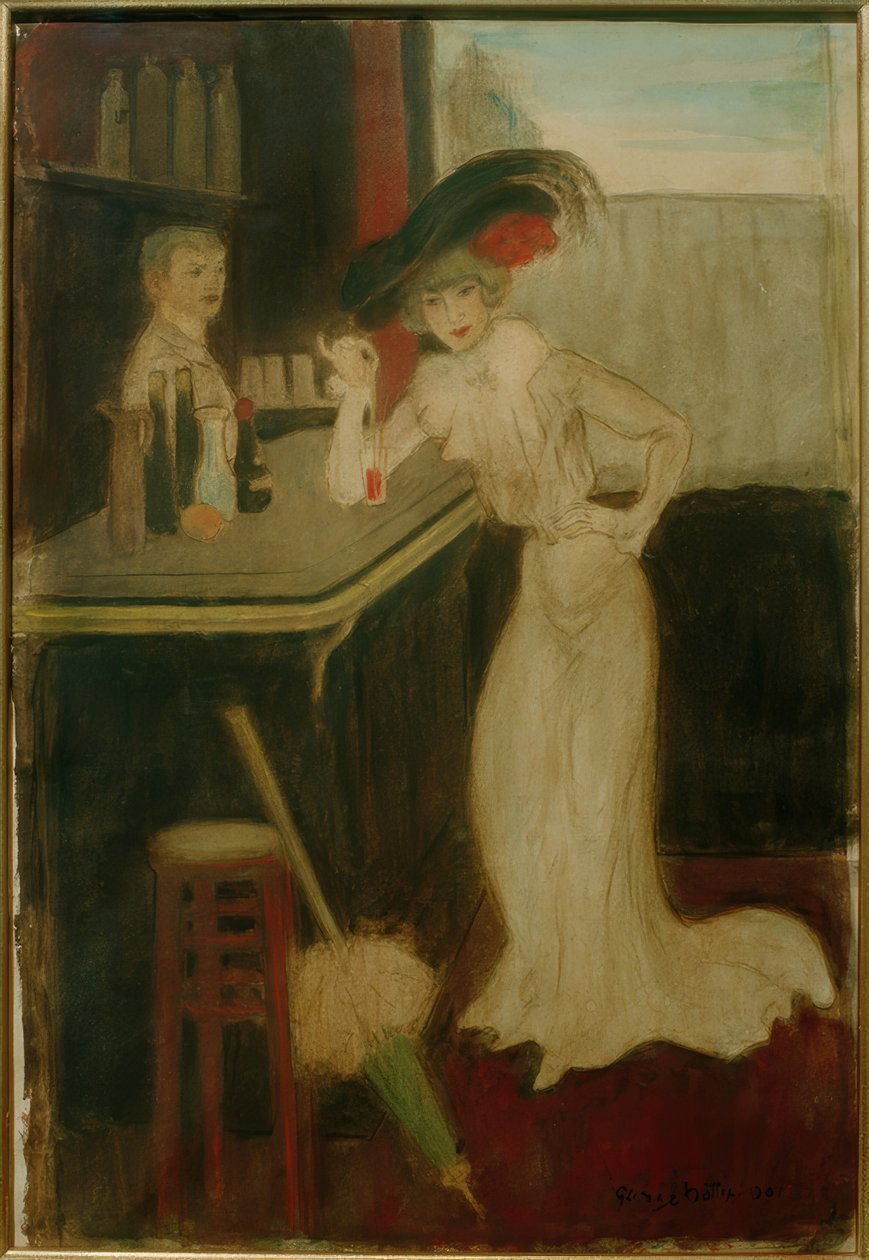 Frau mit Sonnenschirm an der Bar(Woman with Parasol at the Bar)George Bottini |