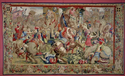 elefant · kampf · krieger · eroberung · tapisserie · soldaten · karthago · schlacht · hannibal · altes rom · war atrocities · war victum · mythology · allegory and literature · history · scipio · wool · handwoven · roman army · carthaginians · battle near zama · battle of zama · romano · giulio · after · Fine Art Images/Heritage Images