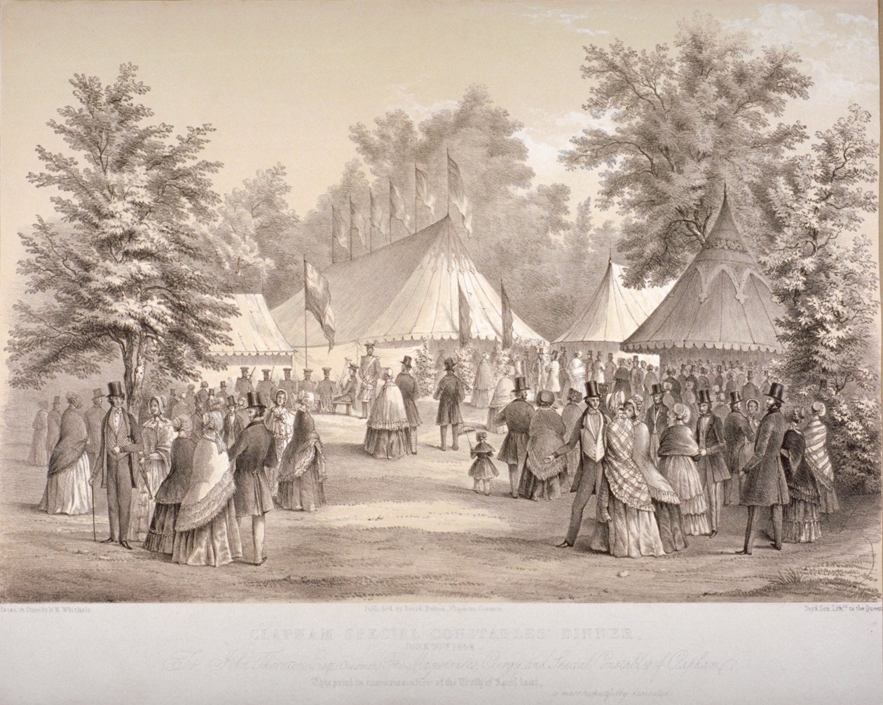 natur · baum · london · england · nahrung · leute · betrieb · land · britisch · englisch · zelt · zelte · abendessen · position · victorian · jahrhundert · großbritannien · einfarbig · festzelt · 19. jahrhundert · schwarzes u. weiß · schwarzes und weiß · 19.jahrhundert · guildhall library art gallery · lithograph · hm whichelo · whichelo · hm · London Metropolitan Archives (City of London)/Heritage Images |
