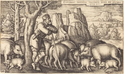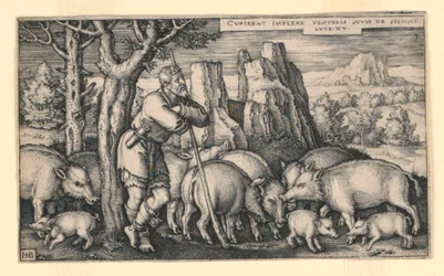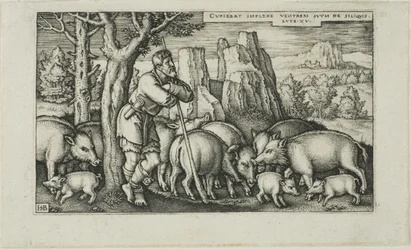 Der verlorene Sohn bei den Schweinen, Platte drei aus Die Geschichte des verlorenen Sohnes(The Prodigal Son with the Swine, plate three from The History of the Prodigal Son)Hans Sebald Beham |