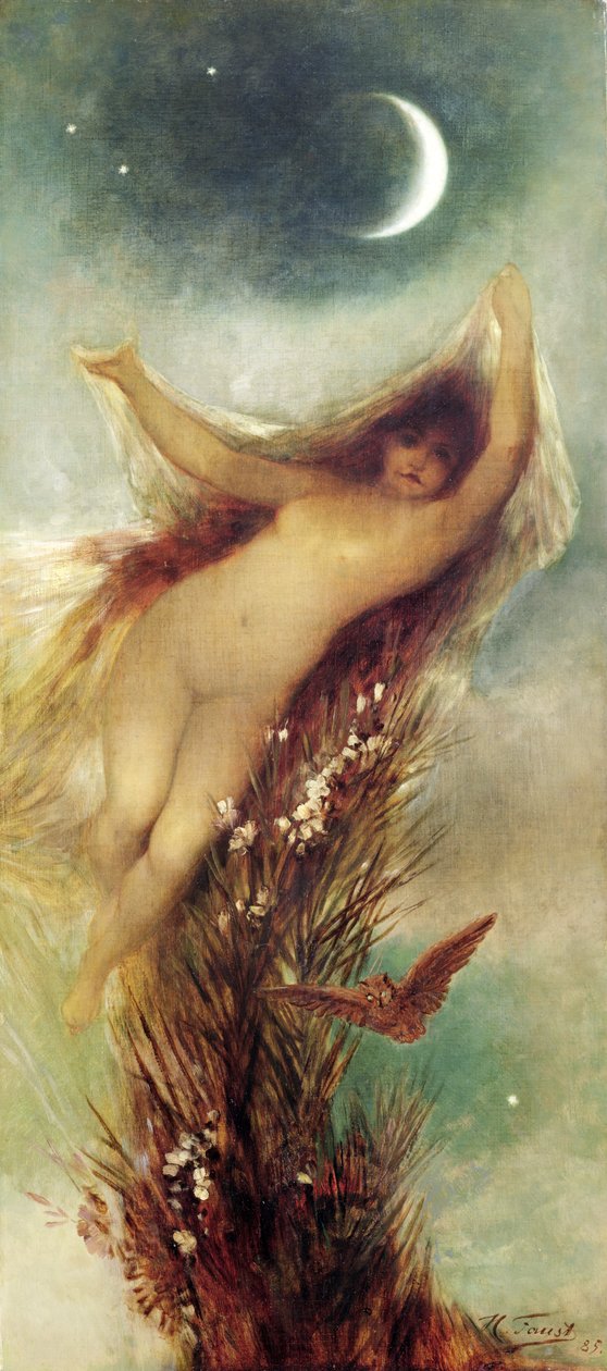 weiblich · nackt · nymphe · eule · halbmond · dunkelheit · sterne · ätherisch · jugendstil · Neue Galerie, Kassel, Germany / Bridgeman Images |