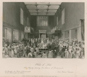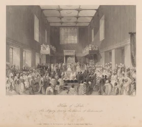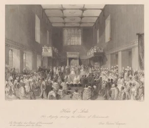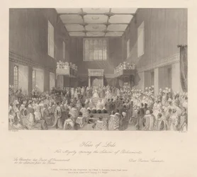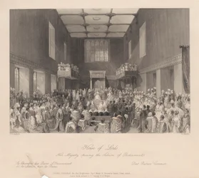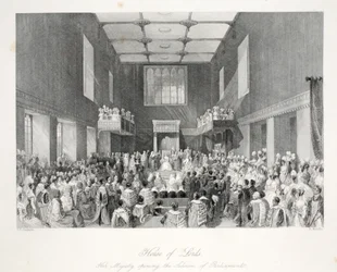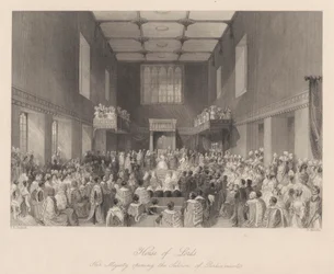 Das House of Lords, Ihre Majestät eröffnet die Parlamentssitzung, graviert von Henry Melville, ca. 1840 Ein Blick auf das House of Peers House of Commons (Der Sprecher rügt eine Person an der Bar) Kings College Eröffnung des Parlaments Verteilung der königlichen Maundy Römisch-katholische Kirche in Moorfields House of Commons (Der Sprecher rügt eine Person an der Bar) Königin Anne im House of Lords, veröffentlicht 1902 Eröffnung des Hörsaals in Marylebone, London Ihre Majestät prorogiert das Parlament - House of Lords King Übergabe des Lancashire Cotton Famine Memorial Window an die Corporation of London, in der Guildhall House of Commons, aus Ihre Majestät prorogiert das Parlament - House of Lords Darstellung der Zeremonie der Übergabe der Sheriffs von London (farbiger Stich) Paris, Palais de Justice - La salle des pas perdus während einer offiziellen Zeremonie - Gravur in „Tableau-de-Paris“ von Edmond Texier 1852 Vortrag der jährlichen Reden in der Großen Halle Hochzeit von Wilhelm IV. mit Prinzessin Anna, 1734 Kapelle Royal im St. James König auf seinem Thron im House of Lords Ferdinand I Die Rede im Christ
