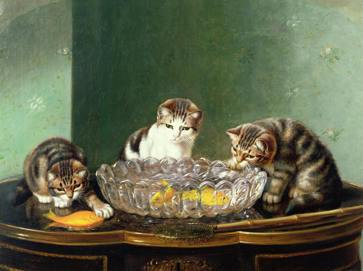 fisch · tier · tiere · wildtiere · fischernetz · fangen · goldfisch · fischglas · katze · spielen · sprung · tisch · kätzchen · katzen · tabby · Private Collection / Bridgeman Images |