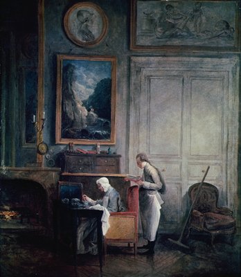 essen · essen · frau · dienerin · vorlesen · lehren · lernen · alte frau · interieur · kamin · siecle des lumieres · aufklärung · intellektuelle · blaustufen · bleublau · besserung · selbstverbesserung · Private Collection / Bridgeman Images
