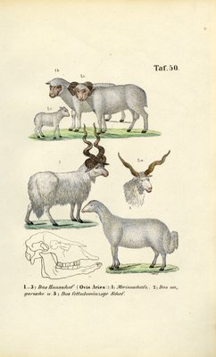 Wildziegen und Ziegenarten mit anatomischen Details von J. W. Tenhaeff. Verfügbar als Kunstdruck auf Leinwand, Fotopapier, Aquarellkarton, Naturpapier oder Japanpapier.