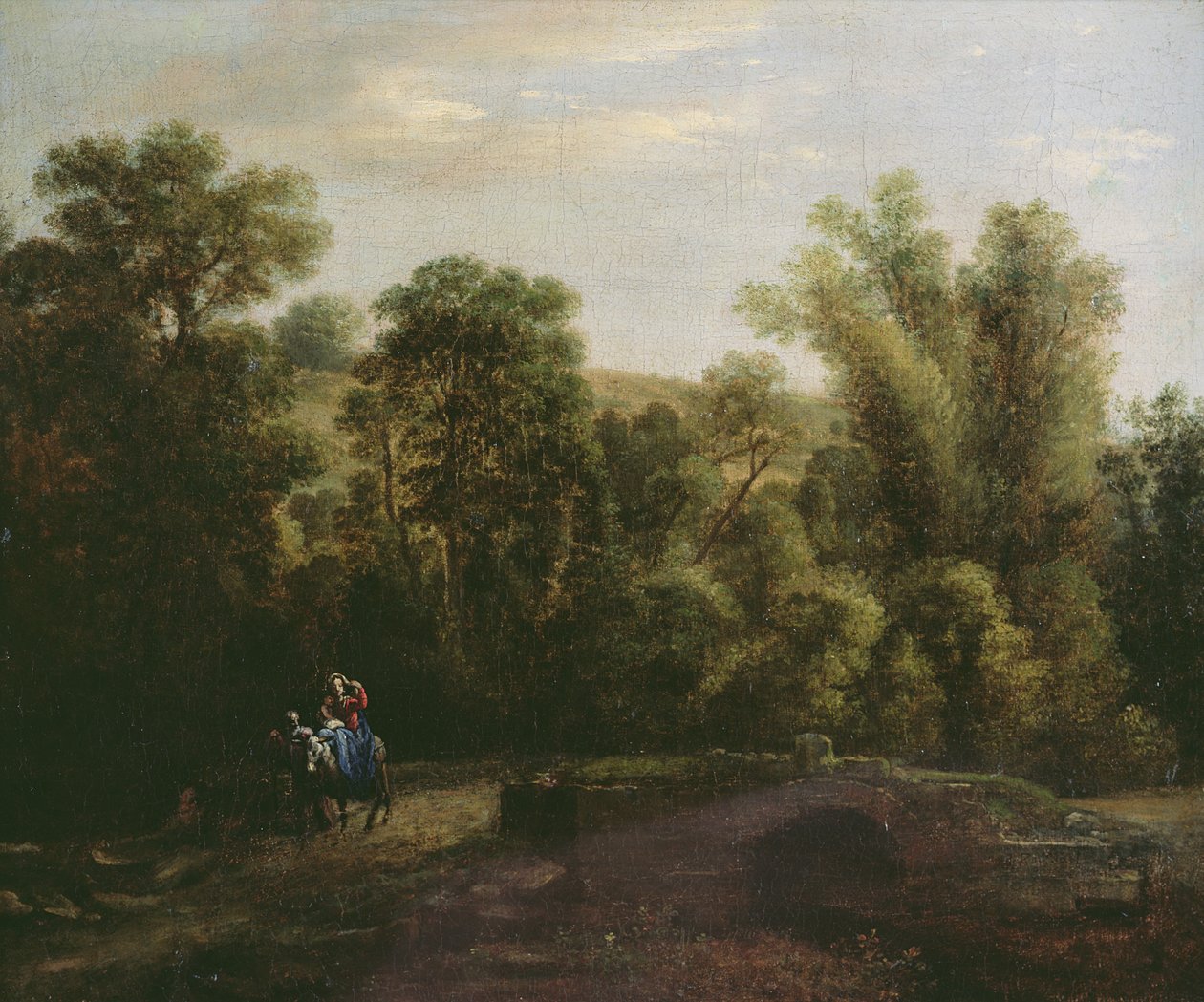 landschaft · fluss · brücke · ruderpferd · figuren · wald · esel · familie · mutter und kind · vater · bäume · wald · strom · ländlich · rustikal · landschaft · straße · pfad · säugling · baby · reiten · pferd · pastoral · Courtesy of the Warden and Scholars of New College, Oxford / Bridgeman Images |