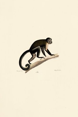 Gewöhnlicher Totenkopfaffe auf einem Ast von Jacques Christophe Werner. Verfügbar als Kunstdruck auf Leinwand, Fotopapier, Aquarellkarton, Naturpapier oder Japanpapier.