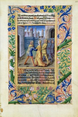 Judith wird von den Assyrern ergriffen, aus dem Stundenbuch von Louis d'Orleans, 1490(Ms Lat. Q.v.I.126 f.45 Judith being seized by the Assyrians, from the Book of Hours of Louis dOrleans, 1490 )Jean Colombe |