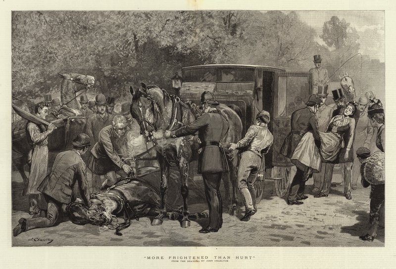 erschrocken · verletzt · pferd · gezeichnet · transport · unfälle · wagen · Private Collection / Bridgeman Images · / Look and Learn |