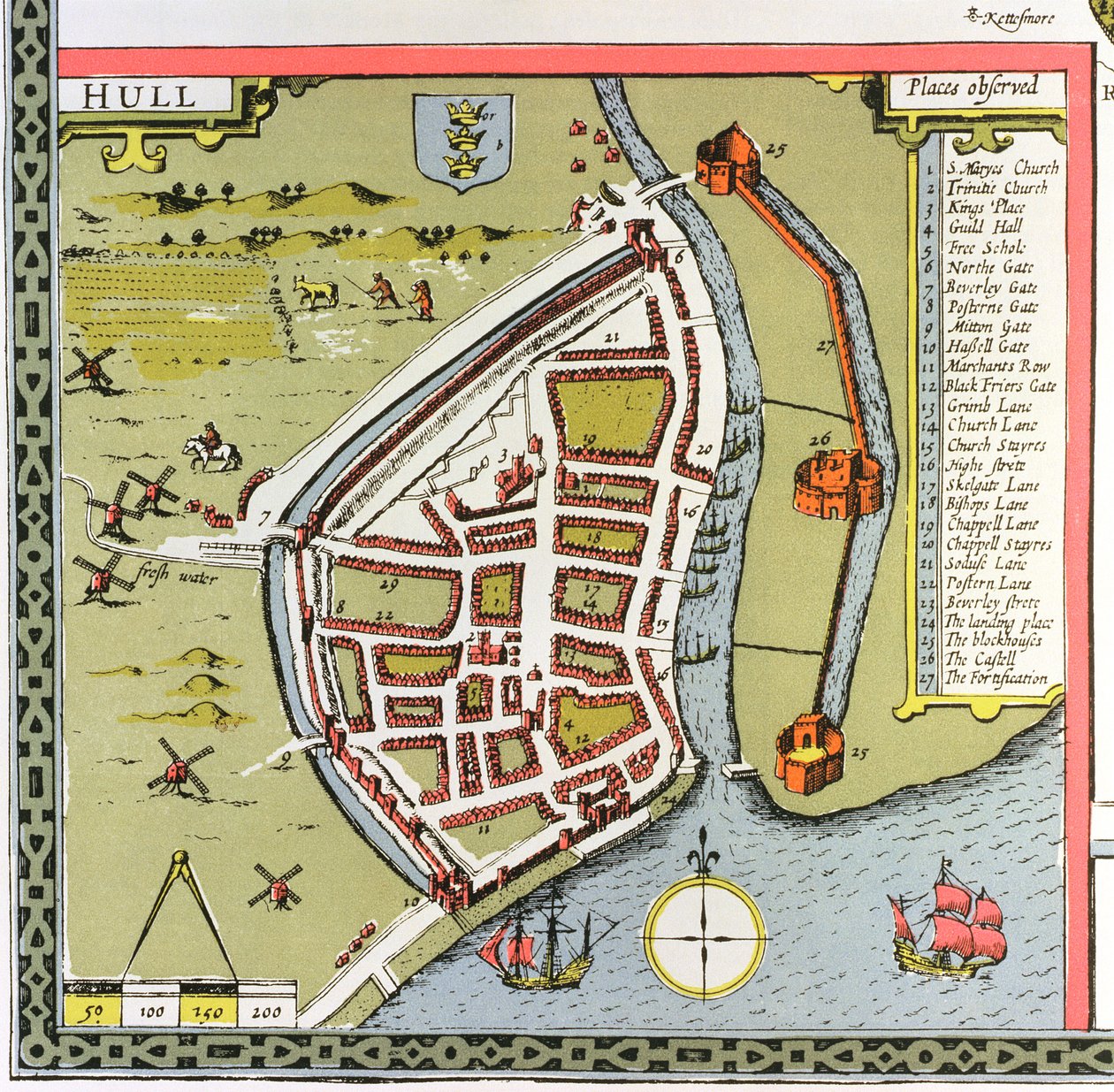 Hull, Detail aus der Karte der Nord- und Ostringe von Yorkshire, graviert von Jodocus Hondius (1563-1612) aus John Speeds 'Theatre of the Empire of Great Britain', veröffentlicht von John Sudbury und Georg(Hull, detail from the map of the North and East Ridings of Yorkshire, engraved by Jodocus Hondius (1563-1612) from John Speed's 'Theatre of the Empire of Great Britain', pub. by John Sudbury and Georg)John Speed |