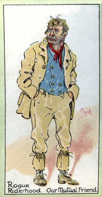 männlich · porträt · volle länge · dickensian · viktorianisch · literatur · literarisch · charakter · karikatur · fiktion · fiktiv · roman · schurke · unser gemeinsamer freund · rogue riderhood · skrupellos · opportunistisch · zigarettenkarte · karte · vintage-karte · vintage · illustration · Private Collection / Bridgeman Images