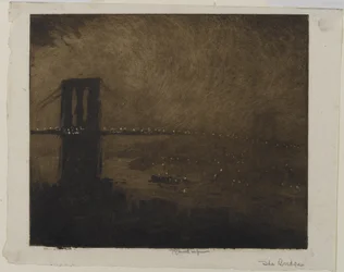 Brooklyn Bridge bei Nacht von Joseph Pennell. Verfügbar als Kunstdruck auf Leinwand, Fotopapier, Aquarellkarton, Naturpapier oder Japanpapier.