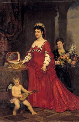 natur · deutschland · stehen · italien · italienisch · frau · frauen · frau · leute · innen · schüssel · musik · frucht · deutsch · hell · betrieb · betriebe · künste · land · spielen · unterhaltung · besetzung · farbe · kleid · ananas · schmucksachen · schmucksachen · oper · position · jahrhundert · musikinstrument · beruf · nach innen · engel · assistent · dame · winged · betrachten der kamera · bediensteter · stringed instrument · oper sänger · putto · farbe · 19. jahrhundert · zuhause · 19.jahrhundert · direct gaze · portrait · adelina · adelina patti · patti · playing an instrument · amorini · national museum of wales · ananas sativus · karl friedrich steinhardt · steinhardt · karl friedrich · adelina juana maria patti · ©National Museum of Wales/Heritage Images
