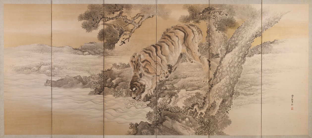 Sechsteilige Leinwand, die einen trinkenden Tiger darstellt(Six-fold screen depicting a drinking tiger, 1749-1838)Kishi Ganku |