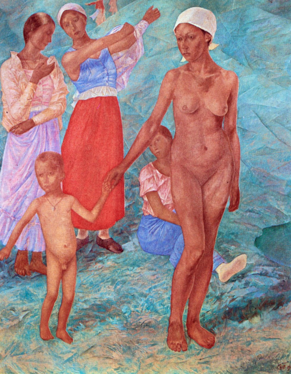 frau · frauen · frau · leute · mann · junge · jungen · kind · kinder · gehen · familie · künste · anstrich · schwimmen · land · blank · nude · kunst · farbe · farbe · morgen · mutter · mutterschaft · position · jahrhundert · rußland · russisch · halten der hände · sohn · plaudern · dame · schwimmenkappe · zeit · nacktheit · nacktheit · mama · abschweifend · sowjet · 1910s · 20. jahrhundert · art media · kuz'ma petrov-vodkin · kuzma petrov-vodkin · kuz'ma sergeyevich petrov-vodkin · kuzma sergeyevich petrov-vodkin · petrov-vodkin · kuz'ma · Art Media/Heritage Images