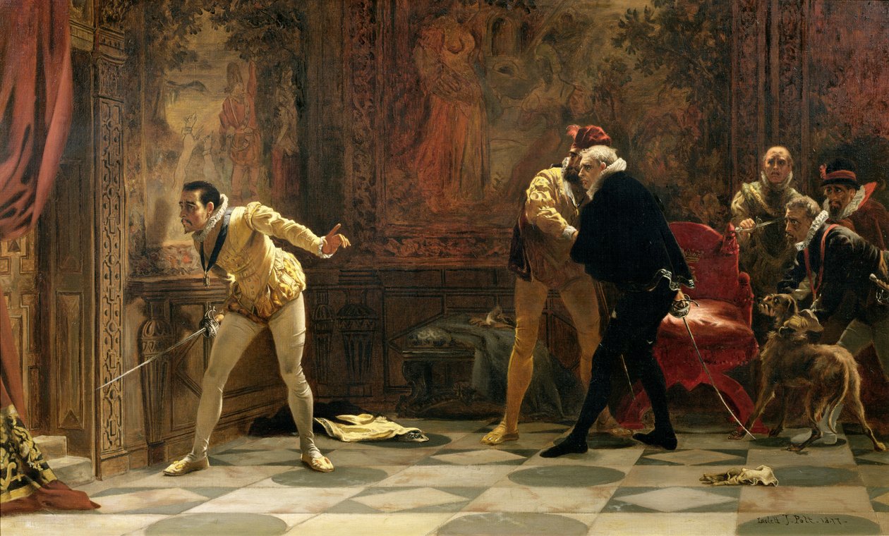 haus der tudor · tudor · tudor-dynastie · tudor-periode · tudor-zeiten · tudor-dynastie · schwert · hund · hinterhalt · gobelinzimmer · verschwörung · maulkorb · warten · grundstück · wams und schlauch · höflinge · mord · attentäter · elisabethanisches kostüm · gemälde · malerei · Towneley Hall Art Gallery and Museum, Burnley, Lancashire / Bridgeman Images |