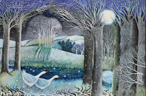 mond · schafe · felder · schnee · landschaft · hügel · vollmond · winter · bäume · vögel · nacht · landschaft · malerei · aquarell · Private Collection / Bridgeman Images