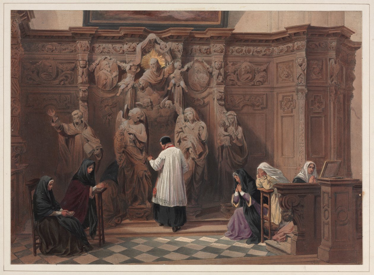 Beichtstuhl, Kirche St. Paul, Antwerpen von Louis Haghe. Verfügbar als Kunstdruck auf Leinwand, Fotopapier, Aquarellkarton, Naturpapier oder Japanpapier.