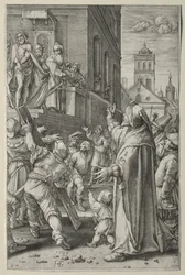 italien · masse · massen · künste · land · kunst · kerl · holländisch · flandern · jerusalem · israel · christ · christentum · christ · barock · jesus · grausamkeit · jahrhundert · bibel · biblisch · konzept · geschlagen · 17. jahrhundert · flämisch · schwarzes u. weiß · schwarzes und weiß · pontius pilate · jesus christ · ecce homo · hendrik goltzius · engraving · christ · jesus · jesus · pilate · pontius · baroque era · goltzius · hendrik · hendrick goltzius · heritage art · henry goltzius · ludovicus siceram · siceram · ludovicus · Heritage Art/Heritage Images