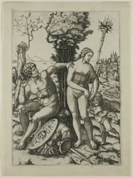 Venus, Mars und Amor, 1508 von Marcantonio Raimondi. Verfügbar als Kunstdruck auf Leinwand, Fotopapier, Aquarellkarton, Naturpapier oder Japanpapier.