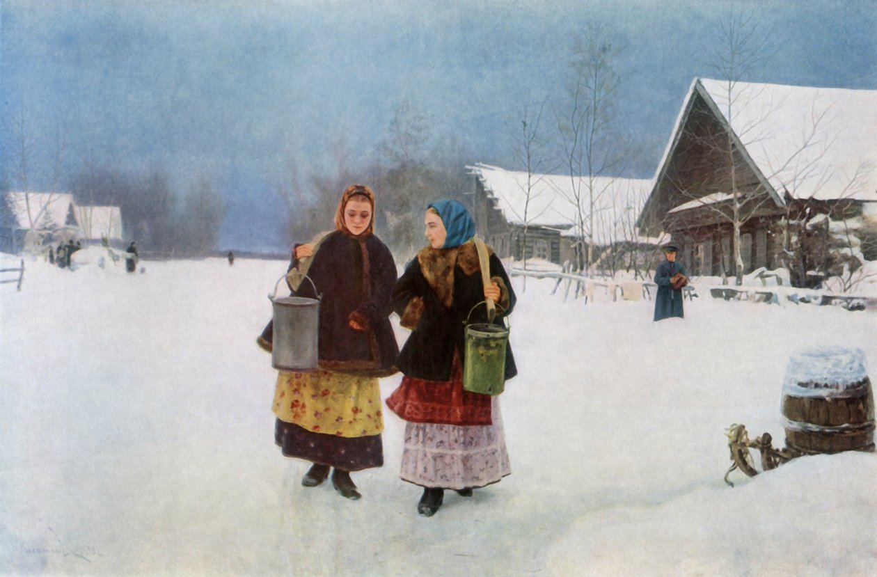 wetter · wasser · vladimir fiala · fiala · vladimir · artia · kasatkin · nikolai alexeyevich · nikolaj alexejewitsch kass · jahreszeit · frau · tragen · frauen · frau · leute · mann · schauen · mann · männer · kalt · anstrich · land · schnee · muster · weiß · kerl · aufpassen · pelz · kleidung · farbe · dorf · kleid · rustic · kabelstrang · position · jahrhundert · rußland · russisch · rock · wanne · eimer · mit blumen · dame · konzept · rivalität · wannen · volle länge · eifersucht · eifersuechtig · rivale · geblüht · sechziger · eimer · wintry · farbe · patterned · realismus · 19. jahrhundert · joch · sechziger jahre · 20. jahrhundert · 19.jahrhundert · landwirtschaftlich · nikolai alekseevich kasatkin · nikolaj alekseevich kasatkin · nikolay kasatkin · nikolay alexeyevich kasatkin · nikolaj alexejewitsch kassatkin · kasatkin · nikolai alekseevich · kassatkin · nikolaj alexejewitsch · regionalism · The Print Collector/Heritage Images |
