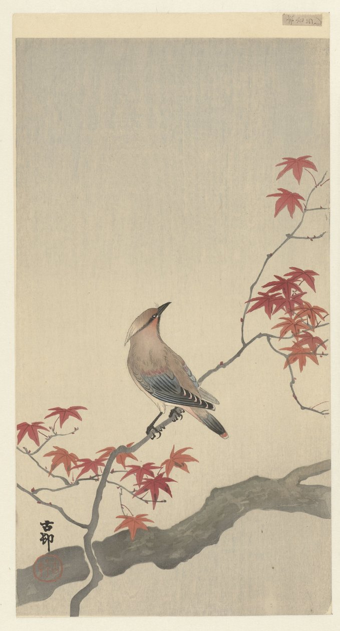 Japanische Seidenschwanz auf Ahorn von Ohara Koson. Verfügbar als Kunstdruck auf Leinwand, Fotopapier, Aquarellkarton, Naturpapier oder Japanpapier.