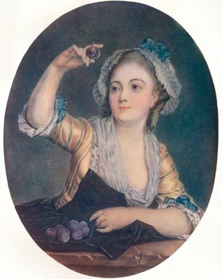 frau · holding · leute · mädchen · mädchen · frucht · zeitschrift · pflaume · kleidung · farbe · farbe · mütze · kleid · jahrhundert · gestikulieren · spitze · eine person · oval · handgeste · arm hob an · pflaume · 18. jahrhundert · 1900s · 20. jahrhundert · achtzehntes jahrhundert · the connoisseur · engraving · portrait · p davesne · davesne · p · The Print Collector/Heritage Images