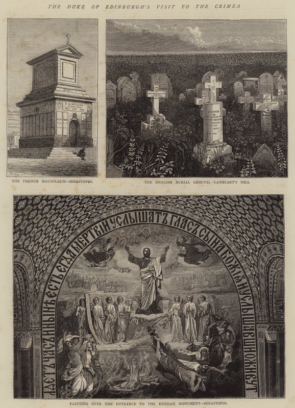herzog von edinburgh · besuch · krim · französisches mausoleum · sebastopol · englischer begräbnisplatz · cathcart' · s hill · gemälde · eingang · russisches denkmal · ukraine · die architektur · friedhöfe · Private Collection / Bridgeman Images · / Look and Learn |