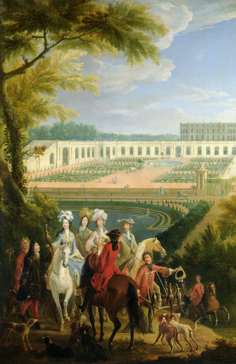 l' · orangerie · savoyen · jagdtracht · falknerei · vögel · jagd · herzogin von burgund · weibchen · reiten · garten · aristokratie · höflinge · Château de Versailles, France / Bridgeman Images |