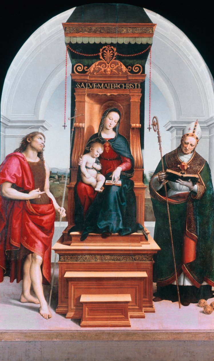 italien · italienisch · st john · saint john the baptist · raphael · raffaello santi · raphael sanzio · rafaello sanzio · sanzio · raphael · frau · holding · frauen · frau · leute · mann · junge · jungen · kind · kinder · mann · männer · familie · fromm · künste · anstrich · kind · baby · babys · land · religion · rein · kunst · kerl · farbe · farbe · mutter · christ · christentum · kindheit · heiliger · mutterschaft · renaissance · position · jahrhundert · sohn · dame · bishop · mama · altarpiece · gehren · inthronisiert · madonna · thron · 16. jahrhundert · crozier · sechzehntes jahrhundert · jungfrau und kind · art media · st john the baptist · virgin mary · jesus christ · john · mary · st nicholas · portrait · madonna · christ · jesus · jesus · virgin · saint mary · virgin mother · mother of god · the virgin mary · stella maris · st mary · john the baptist · saint john · Art Media/Heritage Images