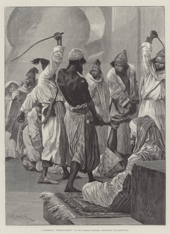 Morgendliche Unterhaltung in der Kasbah, Tanger, Verhängung der Bastonade(A Morning's Entertainment at the Kasbah, Tangier, inflicting the Bastinado )Richard Caton Woodville junior |