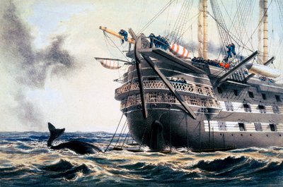 HMS Agamemnon verlegt das ursprüngliche Atlantikkabel, aus 'The Atlantic Telegraph' von William Howard Russell, veröffentlicht 1866(HMS Agamemnon laying the original Atlantic cable, from 'The Atlantic Telegraph' by William Howard Russell, published 1866 (colour litho) (see also 192775-778)Robert Dudley |