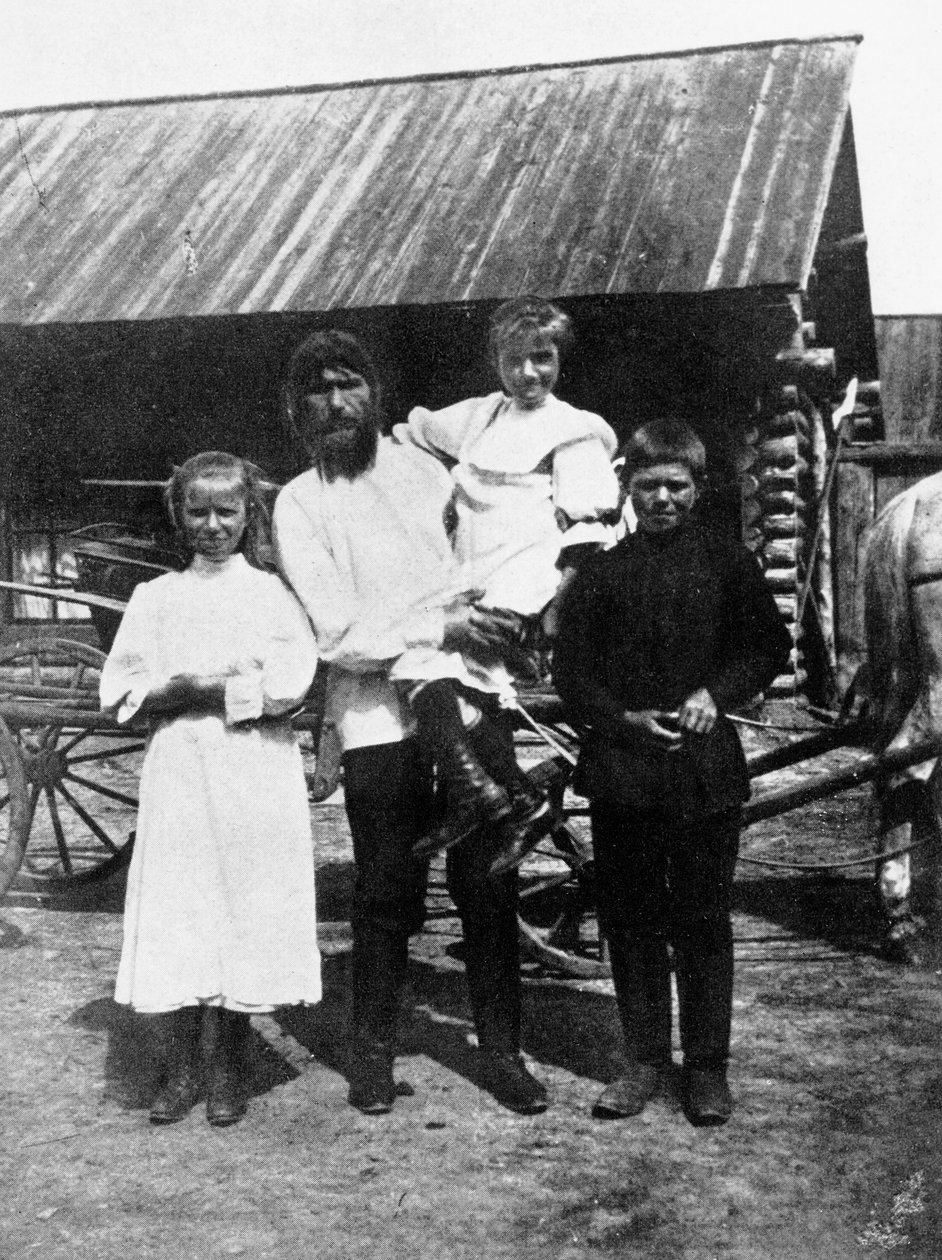 männlich · äußerlich · bart · bärtig · schnurrbart · heiler · grigori · verrückter mönch · prophet · religiös · kontrovers · 19. jh. · 20. jh. · kinder · junge mädchen · mädchen · kind · gruppenporträt · ländlich · hütte · bauern · pferd und wagen · wahnsinn · porträt · Private Collection / Bridgeman Images