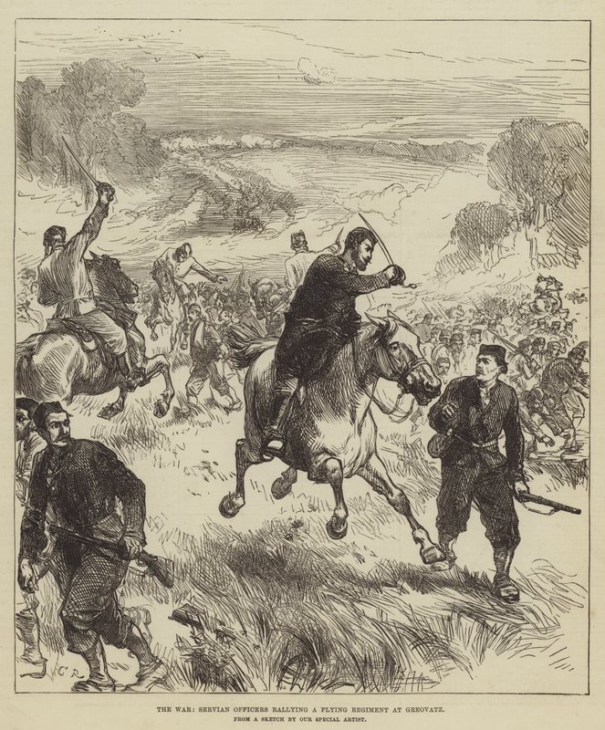 Der Krieg, serbische Offiziere sammeln ein fliehendes Regiment bei Greovatz(The War, Servian Officers rallying a Flying Regiment at Greovatz )Sir John Charles Robinson |