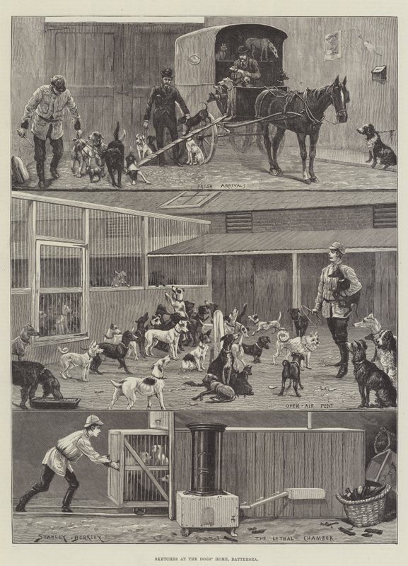 skizzen · hundehaus · battersea · frische ankünfte · open air stifte · tödliche kammer · london · hundeheime · streunende hunde · pferd · gezeichnet · transport · Private Collection / Bridgeman Images · / Look and Learn |