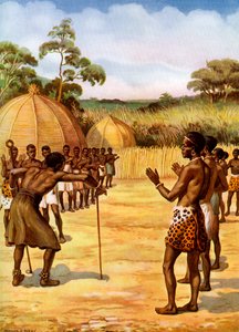 kostüm · mann · eingeborener · afrikaner · geschichte · imperialismus · afrika · abenteuer · vierter wurf · wurf · weiß · jungen · beobachten · lende · rock · eingeborener · kleid · balancieren · angst · rasse · verwirklicht · speer · zumtewayo · zulu · derek · Private Collection / Bridgeman Images · / Look and Learn |