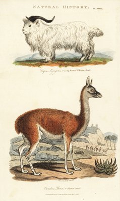 Ziege und Lama (Kupferstich)(Goat and lama - Long-horned whidaw goat, Capra aegagrus, and llama, Lama glama (Glama camel, Camelus lama). Handcoloured copperplate engraving after Sydenham Edwards from John Mason Good's Pantologia, a New Encyclopedia, G. Kearsley, London)Sydenham Teast Edwards |