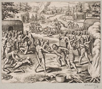 Schlacht zwischen Tuppin-Stämmen, aus 'Newe Welt und Americanische Historien' von Johann Ludwig Gottfried, veröffentlicht von Mattaeus Merian, Frankfurt(Battle between Tuppin tribes, from 'Newe Welt und Americanische Historien' by Johann Ludwig Gottfried, published by Mattaeus Merian, Frankfurt)Theodor de (after) Bry |