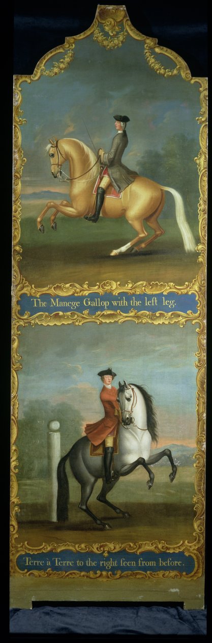 Der Manege-Galopp oder Carriere (oben) und Terre a Terre nach rechts von vorne gesehen (unten)('The Manege Gallop or Carriere' (top) and 'Terre a Terre to the Right seen from Before' (bottom), c.1750 )Thomas, of Pall Mall Butler |