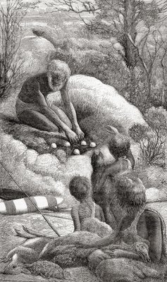 Australische Ureinwohner untersuchen das Nest eines Großfußhuhns(Australian aborigines examine the nest of a megapode.)Unbekannt |