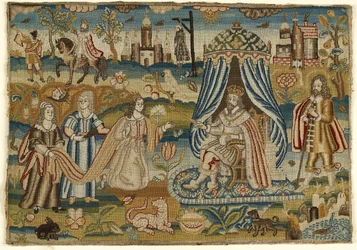außen · draußen · fluß · blau · tier · frau · frauen · frau · leute · mann · mann · männer · tiere · pferde · pferd · schönheit · fromm · land · religion · monarch · grün · kerl · geographie · farbe · farbe · könig · schön · königin · gestreift · königlich · judentum · jüdisch · zelt · zelte · position · jahrhundert · erst · wahl · der iran · iranisch · abgabe · zu pferde · dame · konzept · draußen · riverbank · 17. jahrhundert · altes testament · lager · persisch · persien · esther · portrait · unknown · tapestry · his majesty · ashmolean museum · Ashmolean Museum, University of Oxford/Heritage Images