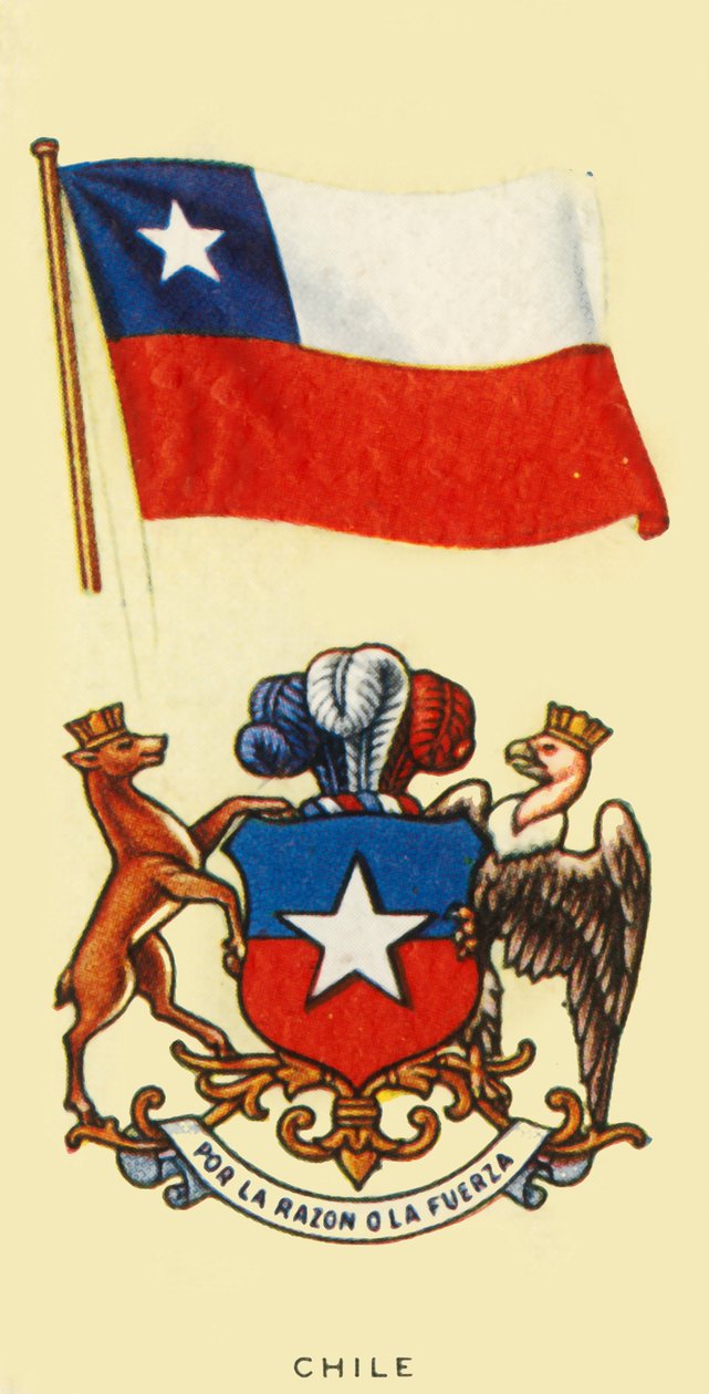 horizontal · blau · tier · national · ende oben · markierungsfahne · markierungsfahnen · stern · vogel · vögel · land · form · symbol · weiß · patriotismus · farbe · rotwild · erklommen · unabhängigkeit · chile · kamm · text · position · jahrhundert · fahne · bild · identität · dreißiger jahre · studioschuß · konzept · nahaufnahme · beschriftung · standard · album · nationale markierungsfahne · farbe · weißer hintergrund · motto · chilenisch · dreißiger jahre · wappen · lateinischer text · 20. jahrhundert · kondor · heraldry · unknown · taylor · john player sons · player · bicolour · chilean flag · national flags and arms · john sons · huemul · jose ignacio zenteno · zenteno · jose ignacio · ignacio zenteno · ignacio andia y varela · varela · ignacio andia y · charles chatworthy wood taylor · charles chatworthy wood · charles wood taylor · carlos wood · The Print Collector/Heritage Images