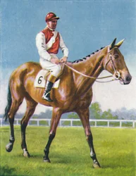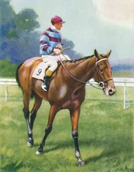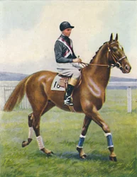 blau · portrait · tier · leute · mann · sport · sport · mann · männer · kappe · tiere · pferde · pferd · reiten · mitfahrer · jockey · bucht · gras · kerl · headdress · farbe · farbe · braun · gewinnen · kleid · jahrhundert · sieger · rennen · kleidung · dreißiger jahre · sportsmen · sportsman · pferd laufen · seiden · zu pferde · konzept · colt · pferd rennen · kopfbedeckung · thoroughbred · racetrack · ziffer · rotwein · rennpferd · dreißiger jahre · 20. jahrhundert · horse-race · horse-racing · unknown · albert · cigarette card · wd ho wills · wills · wd ho · wd and ho wills · number 9 · albert richardson · legend of france · white rose stakes · The Print Collector/Heritage Images