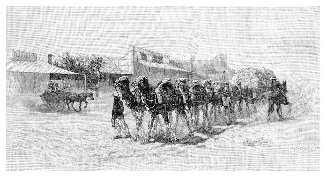 transport · transport · tier · straße · gebäude · gebäude · tiere · straße · new-south.wales · australien · australasien · australisch · land · allee · kamel · kamele · position · jahrhundert · kamelzug · einfarbig · 19. jahrhundert · schwarzes u. weiß · schwarzes und weiß · 19.jahrhundert · engraving · wood engraving · unknown · andrew · frederic b schell · schell · frederic b · andrew garran · garran · The Print Collector/Heritage Images |