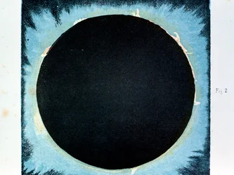 wissenschaft · astronomie · farbe · farbe · eklipse · jahrhundert · solareklipse · natürliche phänomene · 19. jahrhundert · corona · 19.jahrhundert · vorsprung · oxford science archive · chromolithograph · anon · anonymous · warren de la rue · de la rue · warren · camille flammarion · flammarion · camille · Oxford Science Archive/Heritage Images