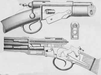 ende oben · zwei · feuerwaffe · waffe · waffen · gewehr · gewehren · krieg · abbildung · jahrhundert · zeitung · gewehr · konzept · auslöser · einheit · hebel · nahaufnahme · einfarbig · kriegsführung · 19. jahrhundert · schwarzes u. weiß · schwarzes und weiß · kampfmittel · 19.jahrhundert · engraving · object · unknown · magazine rifle · vetterli · The Print Collector/Heritage Images