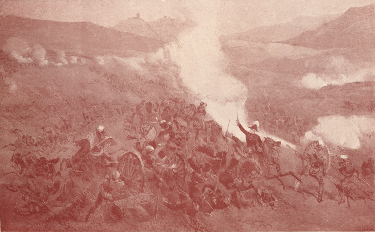 leute · mann · mann · männer · künste · buch · kerl · rauch · zeitschrift · ansicht · britisch · aufladung · ukraine · militärisch · krieg · kanone · position · jahrhundert · vista · gestikulieren · großbritannien · literatur · konzept · aufladung · schlacht · verletzt · verletzung · kavallerie · balaclava · handgeste · arm hob an · einfarbig · armee · kriegsführung · militärische uniform · 19. jahrhundert · schlachtfeld · schwarzes u. weiß · schwarzes und weiß · erhöhte ansicht · 1900s · 20. jahrhundert · bewaffnungen · 19.jahrhundert · the connoisseur · lithograph · landscape · unknown · arial view · ralph · nevill · ralph nevill · british military prints · edward morin · morin · edward · The Print Collector/Heritage Images |
