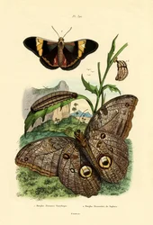 Wald-Riesenaugenfalter, Caligo eurilochus 1 und Brassolis sophorae Schmetterling, Puppe und Raupe 2(Forest giant owl butterfly, Caligo eurilochus 1 and Brassolis sophorae butterfly, pupa and caterpillar 2)Unbekannt |
